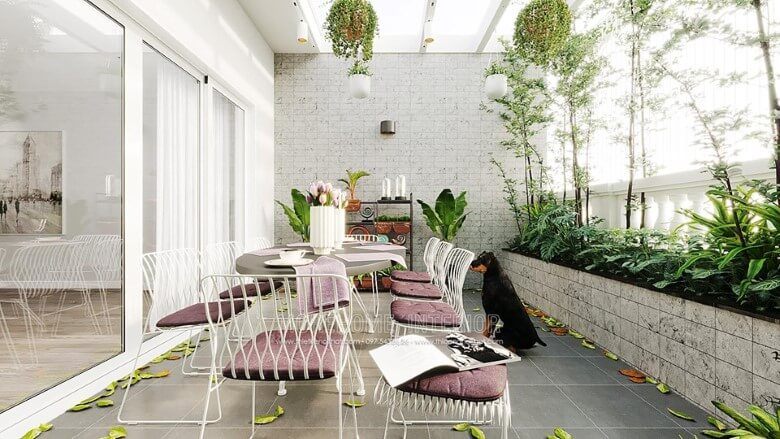 Được bố trí sắp xếp những tiêu cây cảnh, hoa màu sắc đan xen mát mẻ trao đổi bầu không khí trong lành dễ chịu.