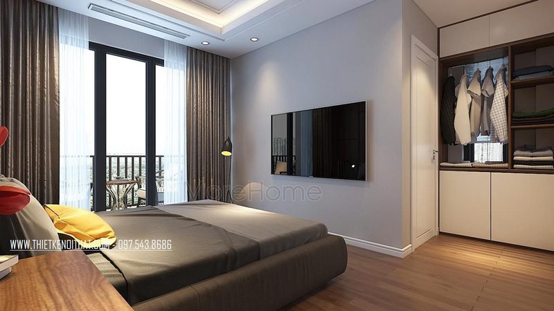 Nội thất phòng ngủ bố mẹ đẹp được bố trí khoa học, hợp lí, chiếc tủ quần áo âm tường được thiết kế kịch trần, cửa hướng ra ban công được lựa chọn với chất liệu kính cao cấp tạo độ rộng thoáng hơn cho cả không gian
