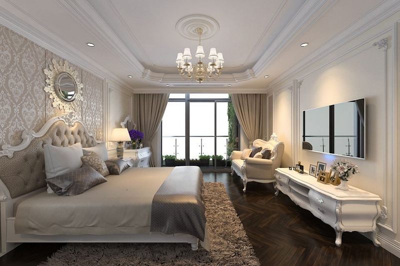 Mẫu phòng ngủ cho chung cư, nhà phố, biệt thự phong cách tân cổ điển với nội thất gỗ công nghiệp sơn trắng cao cấp, lấy ánh sáng tự nhiên từ hệ thống 2 cửa kính cường lực ban công, giúp căn phòng luôn sáng sủa và có sự liên kết với không gian bên ngoài
