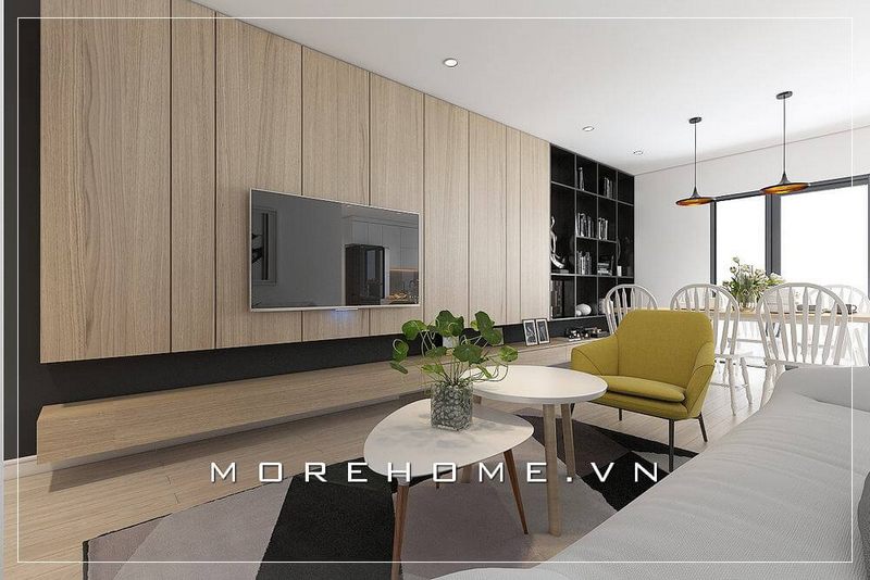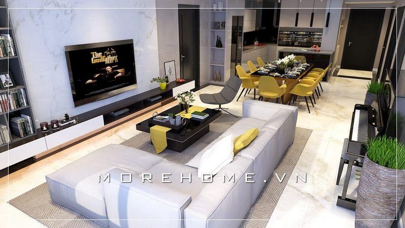 Với xu hướng thiết kế phòng khách liền phòng bếp ăn phong cách hiện đại và kết hợp khéo léo của tone màu ghi} tạo nên không gian hài hòa, thông thoáng cho căn hộ chung cư hiện đại.