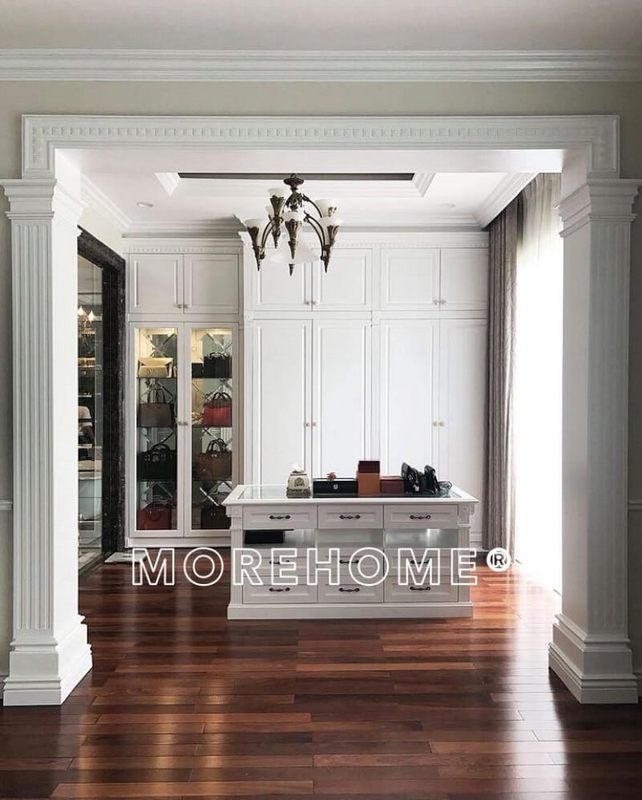 Việc thi công phòng thay đồ với phong cách tân cổ điển, sơn màu trắng sang trọng sẽ được thực hiện tại biệt thự Ciputra Hà Nội, bao gồm cả phòng thay quần áo.