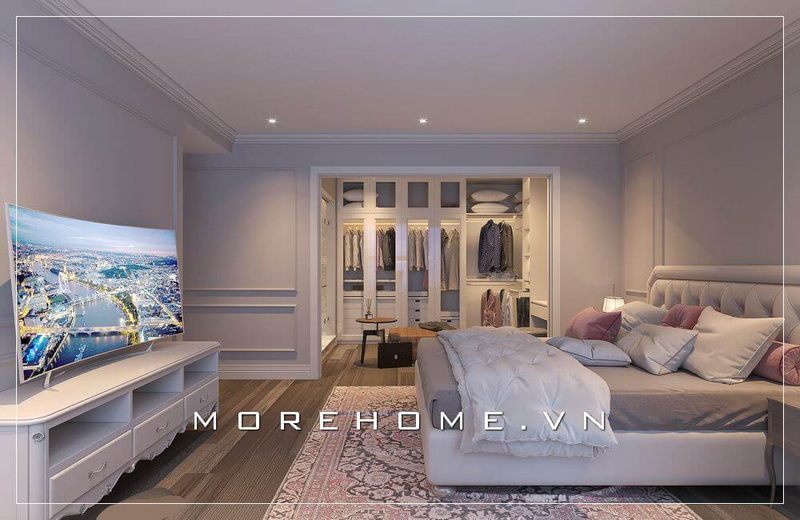 . Không gian nghỉ ngơi của gia chủ được trang trí bằng nội thất phòng ngủ Master phong cách tân cổ điển sang trọng và ấn tượng, bao gồm các món đồ gỗ tự nhiên màu trắng, sàn gỗ màu nâu trầm mang đến cảm giác ấm áp.